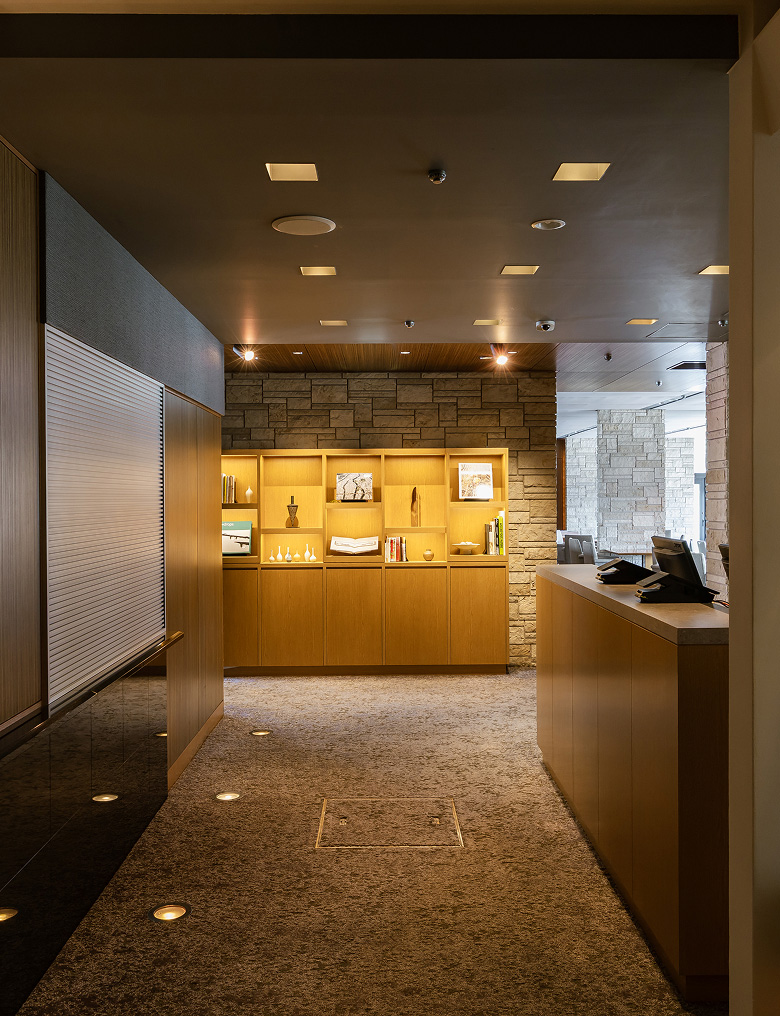 The lounge entrance features artworks inspired by “water,” a symbol of Hiroshima’s landscape and a collection of books on the Seto Inland Sea (Setouchi). Both the artwork and books are carefully selected by READAN DEAT, a Hiroshima-based gallery and shop.